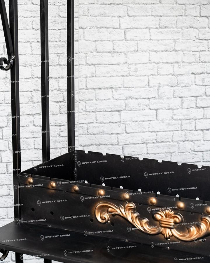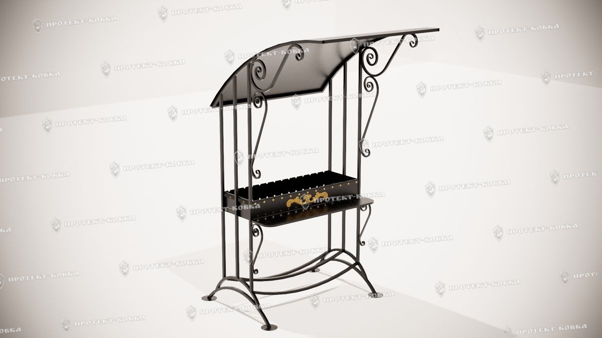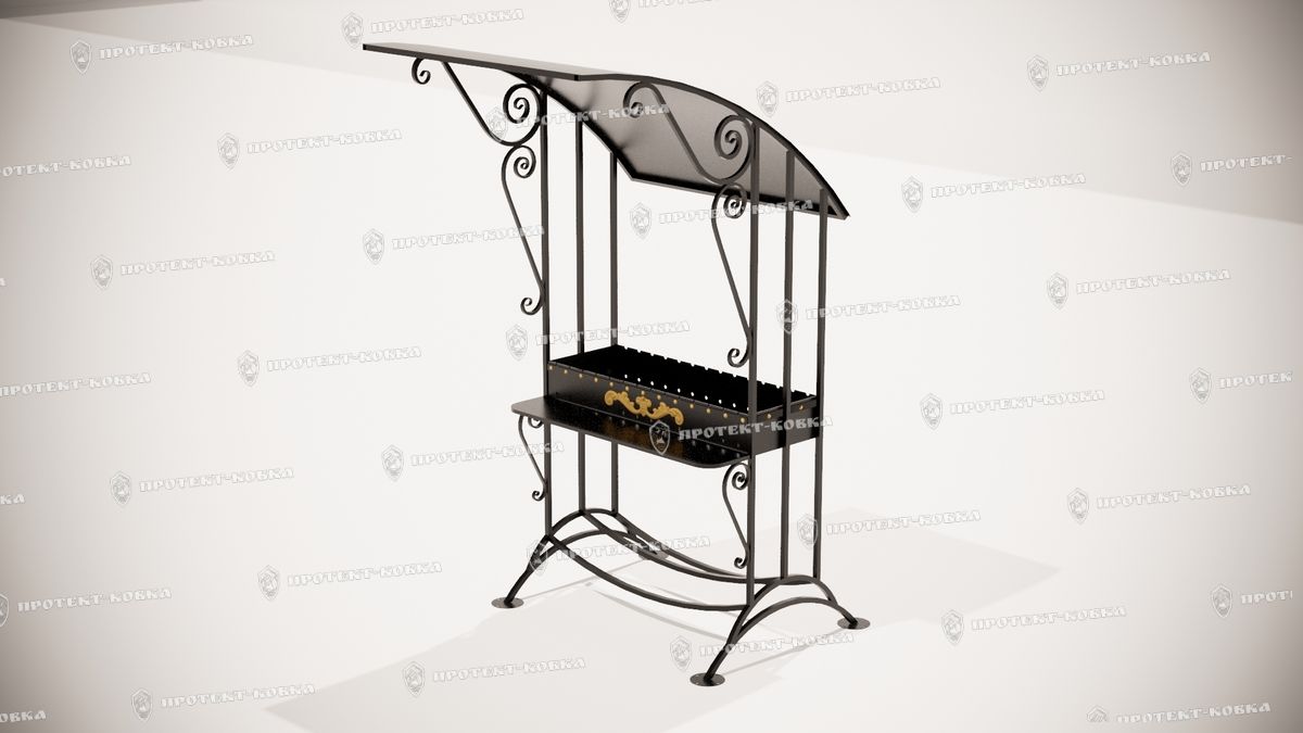 Изделие производится из кованых элементов, оснащено скатной крышей и трубой для отвода дыма. Внизу предусмотрена решетка для дров или угля, в рабочей части есть металлическая полка, на которой можно хранить продукты, посуду, а также инструменты для удаления золы и поддержания горения.